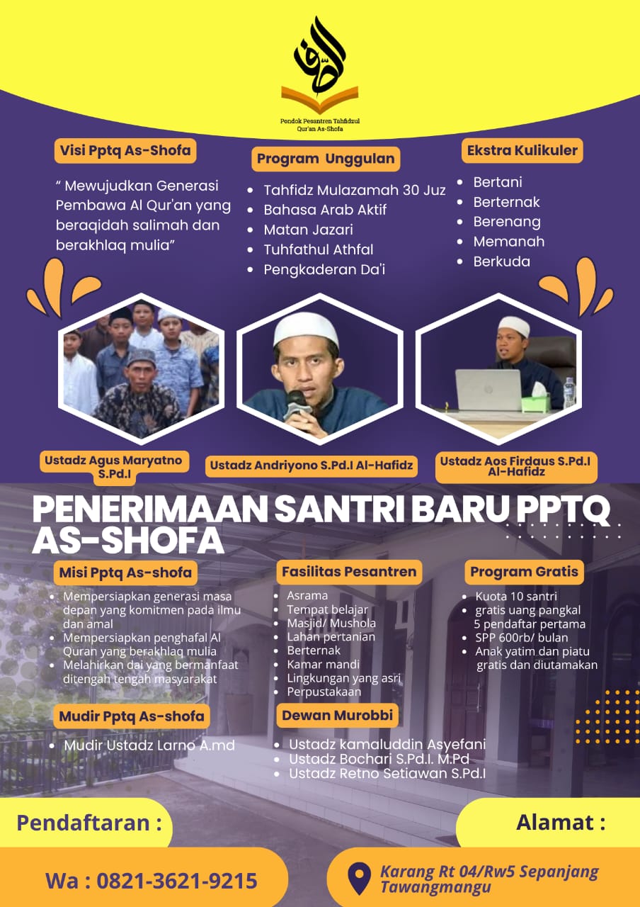 *PENDAFTARAN SANTRI BARU   PONDOK PESANTREN TAHFIDZ AL-QUR'AN AS-SHOFA TAHUN AJARAN 2025/2026*   Visi: " Mewujudkan Generasi Pembawa Al Quran yang beraqidah salimah dan berakhlaq…
