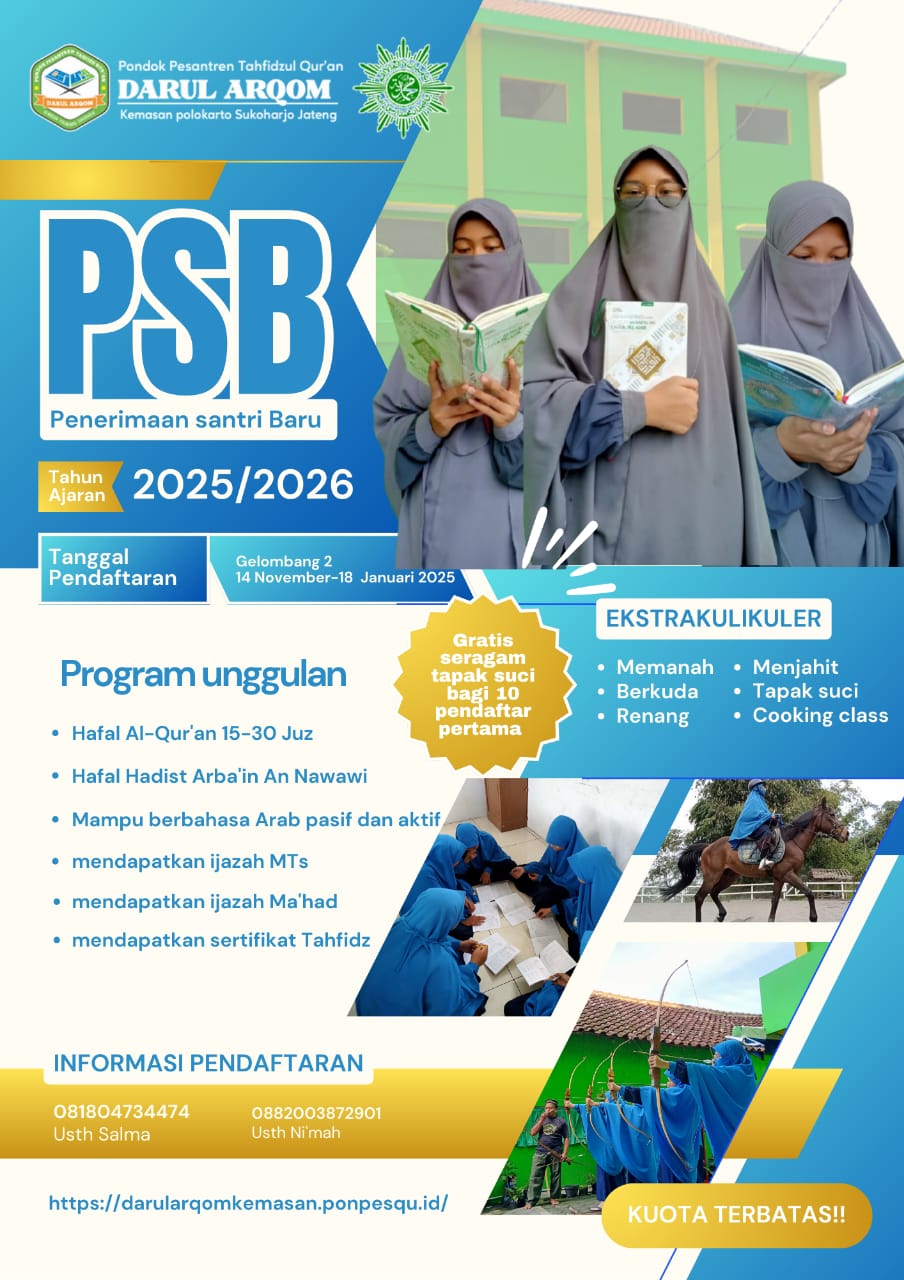 INFORMASI PENERIMAAN SANTRI BARU PPTQ DARUL ARQOM TAHUN AJARAN 2025-2026 PROGRAM UNGGULAN Hafal Al Qur'an 15-30 juz Hafal Hadits Arbain An Nawawi Menguasai bahasa arab pasif maupun aktif Mendapatkan…