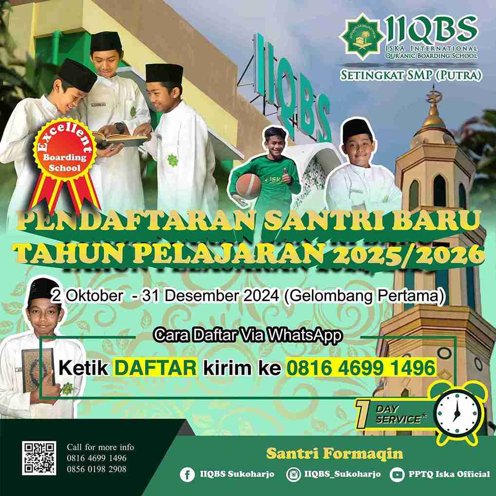 INFORMASI PENDAFTARAN SANTRI BARU ISKA INTERNATIONAL QUR’ANIC BOARDING SCHOOL SUKOHARJO TAHUN AJARAN 2025-2026 KUOTA : 28 SANTRI PUTRA  Informasi Pendaftaran : 081646991496 (Admin PPTQ ISKA)…