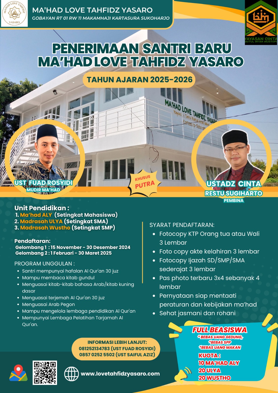 PENERIMAAN SANTRI BARU MA'HAD LOVE TAHFIDZ YASARO 2025-2026 (PUTRA) UNIT PENDIDIKAN: 1.Ma'had ALY (Setingkat Mahasiswa) 2.Madrasah ULYA (Setingkat SMA) 3.Madrasah WUSTHO (Setingkat SMP) PROGRAM…